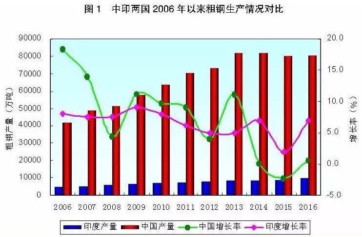 世界钢铁协会(WSA)公布的统计数据显示,在2006~2016年期间,中国粗钢产量由4.210亿吨提高到8.084亿吨,增长了92.0%,年均增长9.2个百分点;印度的粗钢产量由4945万吨提高到9562万吨,增长了93.4%,年均增长9.3个百分点;中国粗钢产量与印度粗钢产量的比例关系则由8.51倍小幅下降到8.45倍。显然,粗略而言,在这期间,中国粗钢产量与印度粗钢产量总体同步增长,印度由于基数小,增长幅度较中国稍高0.1个百分点,而中国钢产量仍然是印度钢产量的8.5倍。而在此期间的大多数年份,中国钢产量曾是印度钢产量的9倍乃至10倍多。