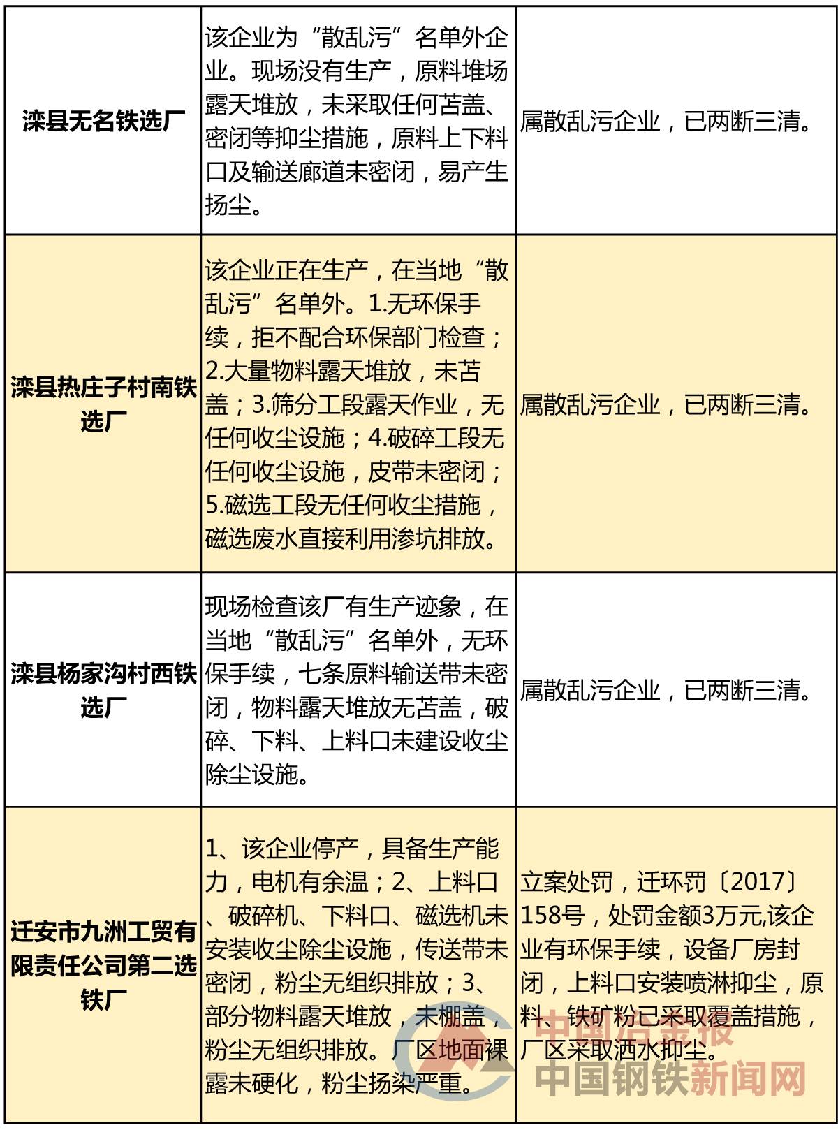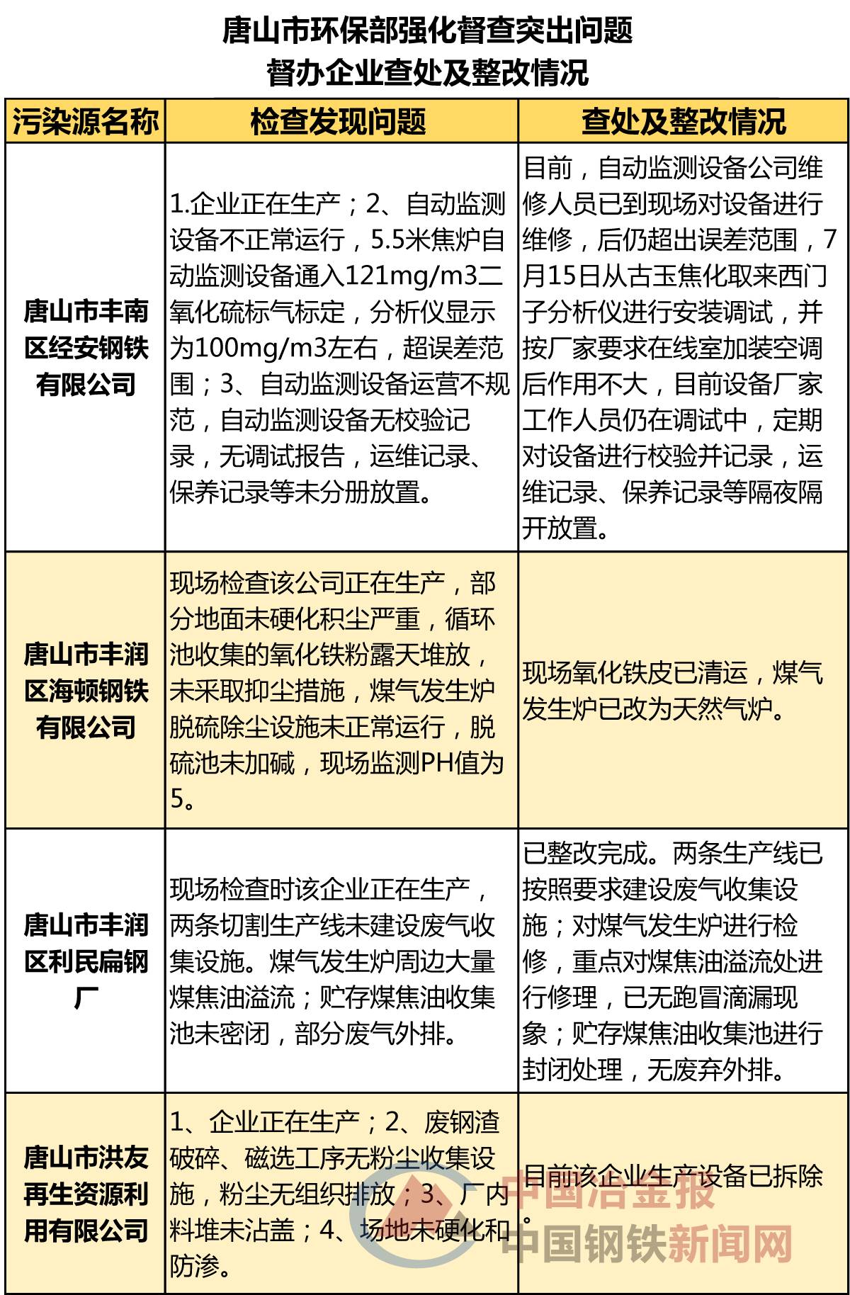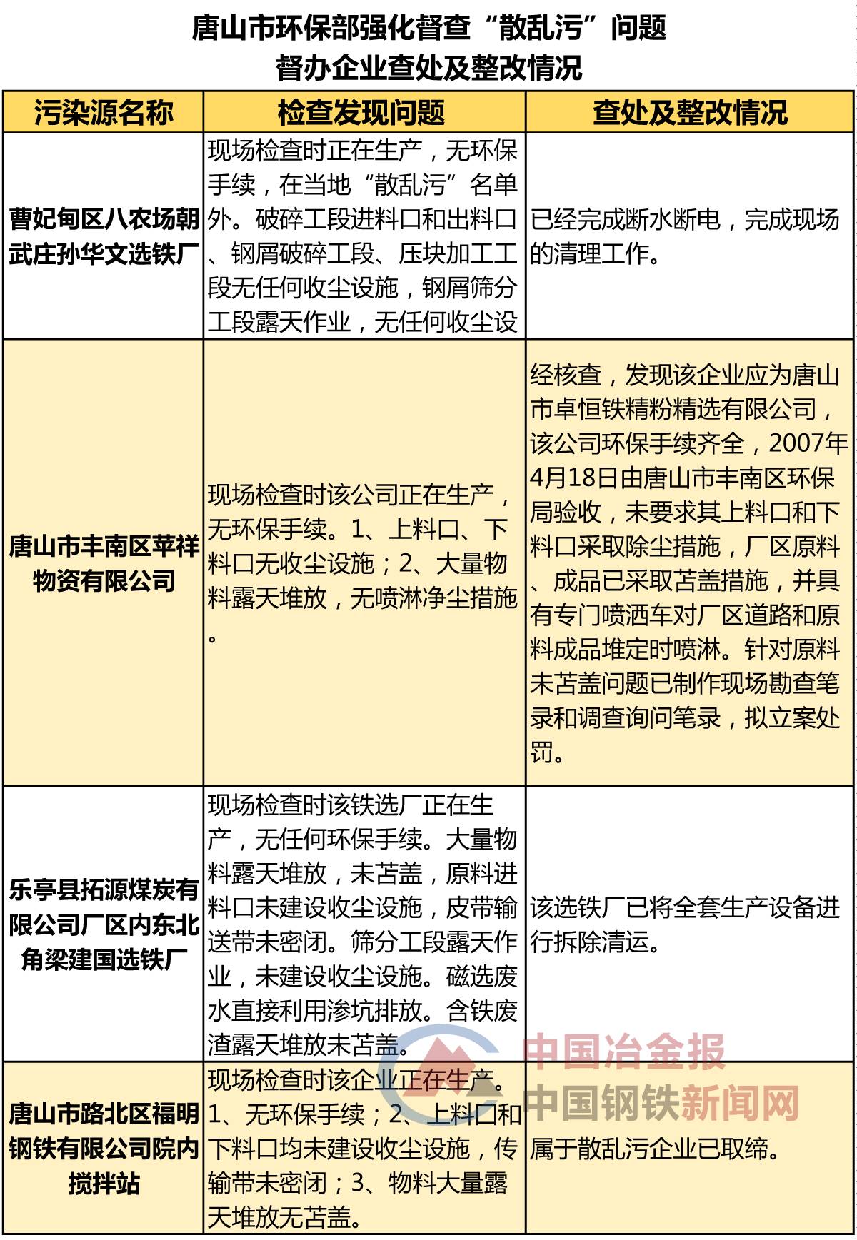 近日,河北省唐山市发布强化督查督办企业查处及整改情况的公示(以下简称“公示”),列出了唐山市环保部强化督查“散乱污”问题督办企业查处及整改情况以及唐山市环保部强化督查突出问题督办企业查处及整改情况,涉及污染源446处,其中,包括唐山市丰南区经安钢铁有限公司、唐山汇丰钢铁有限公司、滦县热庄子村南铁选厂等一批钢铁相关企业被罚款、整改或关停取缔,具体名单如下: