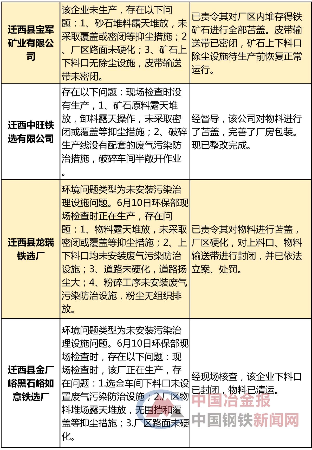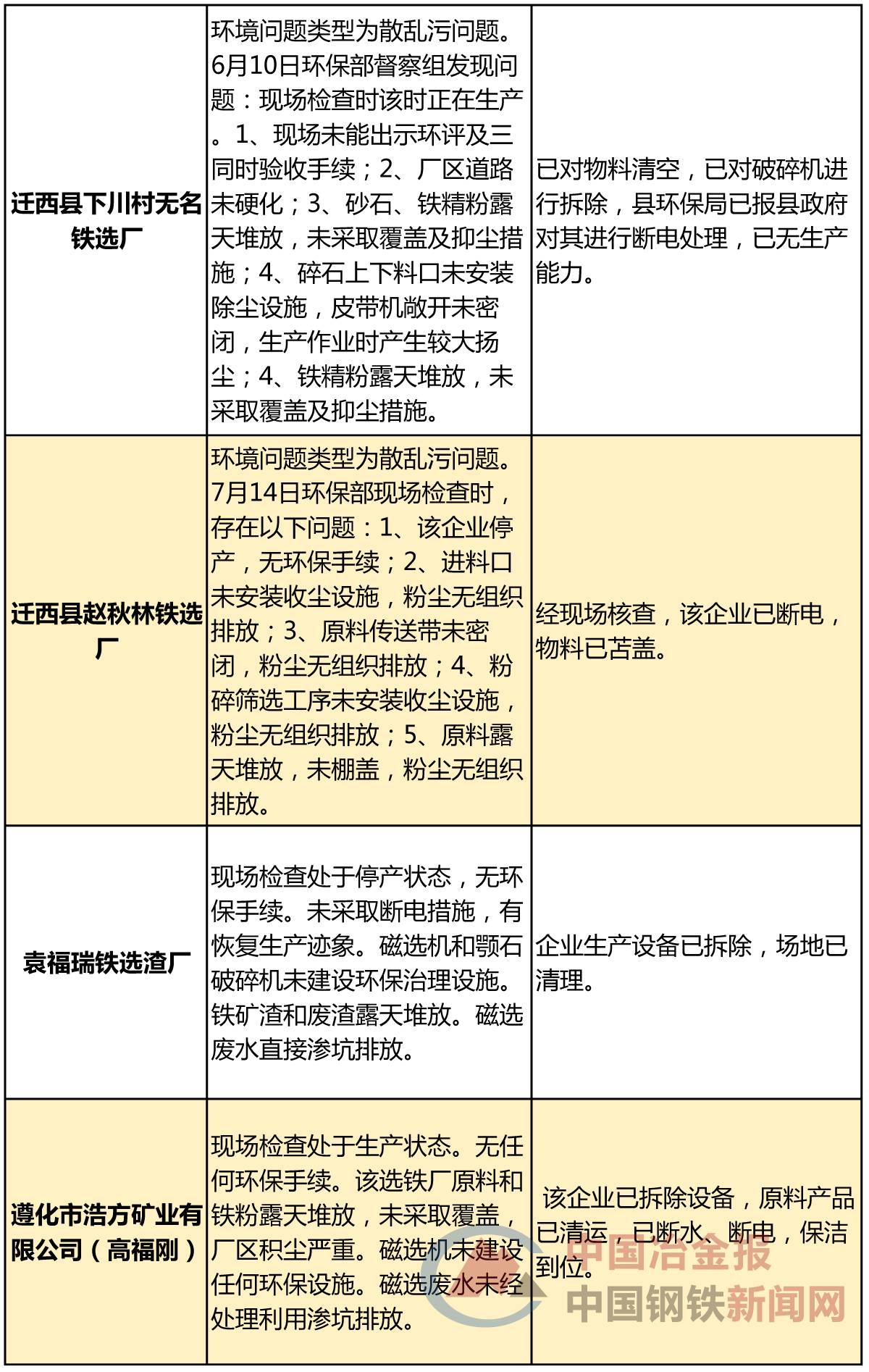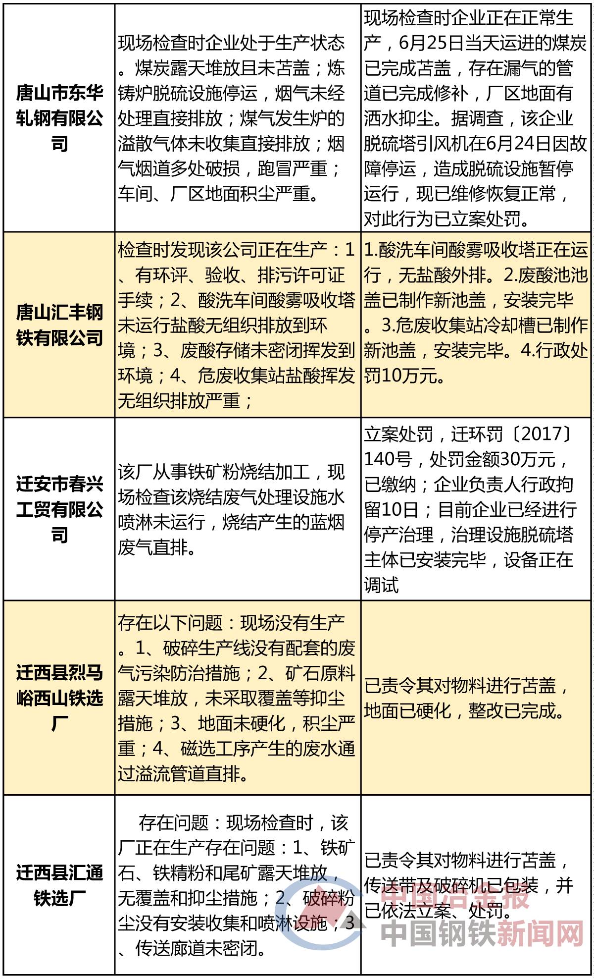 近日,河北省唐山市发布强化督查督办企业查处及整改情况的公示(以下简称“公示”),列出了唐山市环保部强化督查“散乱污”问题督办企业查处及整改情况以及唐山市环保部强化督查突出问题督办企业查处及整改情况,涉及污染源446处,其中,包括唐山市丰南区经安钢铁有限公司、唐山汇丰钢铁有限公司、滦县热庄子村南铁选厂等一批钢铁相关企业被罚款、整改或关停取缔,具体名单如下: