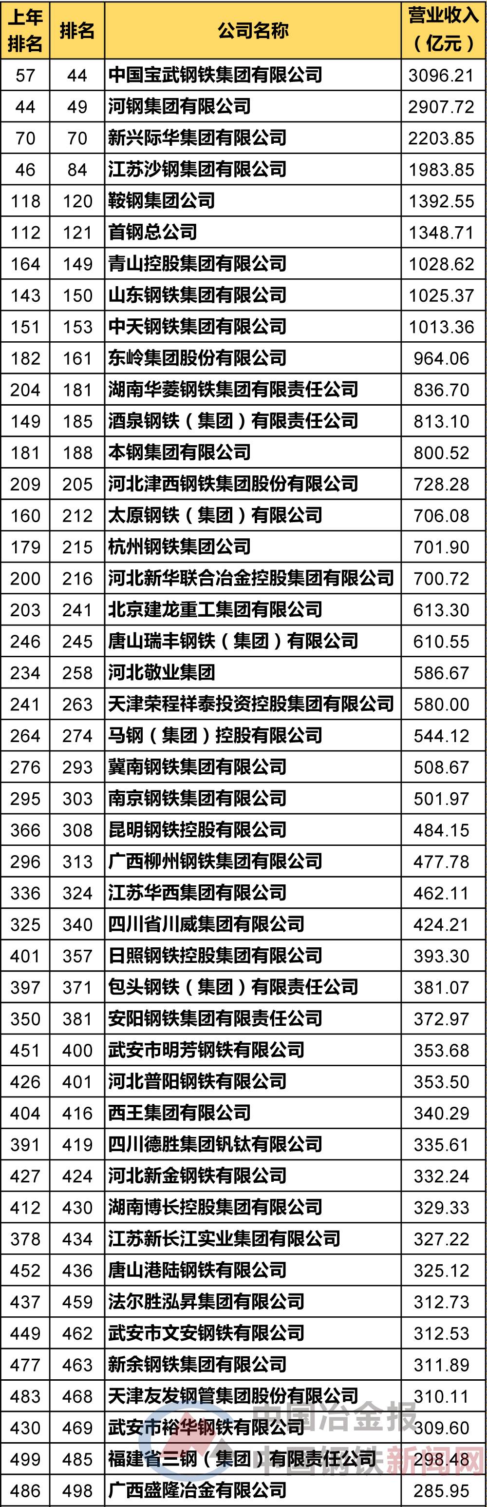 《中国冶金报》-中国钢铁新闻网记者将上榜的钢铁行业企业名单及具体排名整理如下——
