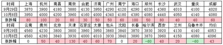 受到北方限产、钢坯大涨、钢厂拉涨等因素的影响,国庆节期间全国建筑钢材价格小幅上涨,Mysteel调研数据显示,截止10月8日,全国20mm螺纹钢均价为4053元/吨,较节前上涨43元/吨,其中天津市场上涨幅度最大,为130元/吨,紧随其后的是海口、杭州,涨幅在100元/吨,排行第三的是南京和长沙,涨幅为80元/吨,其他市场均以小幅上涨为主。值得一提的是乌鲁木齐以及哈尔滨市场却以下跌为主,幅度在60元/吨左右。