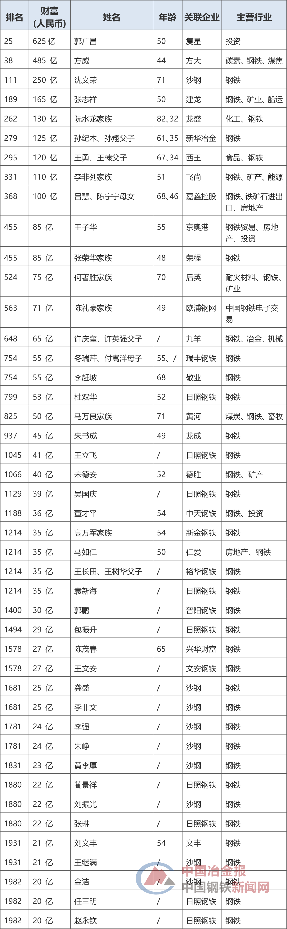 10月12日,胡润研究院发布《36计?胡润百富榜2017》。《中国冶金报》-中国钢铁新闻网统计,上榜的个人或家族中,涉及钢铁行业的达到44人(家)。具体如下——