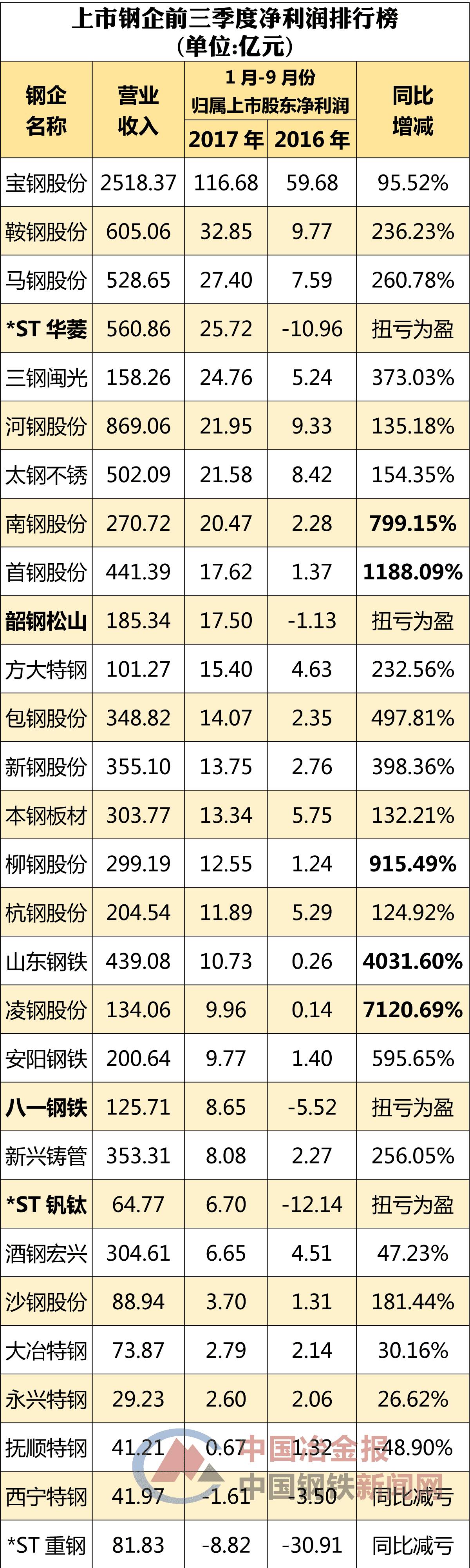 宝钢股份前三季报度业绩亮眼,其三季报显示,前三季度,归属于上市公司股东的净利润为116.68亿元,同比增长95.52%。其中,第三季度归属上市公司股东净利润接近55亿元。此外,凌钢股份、山东钢铁、首钢股份、柳钢股份、南钢股份等钢企净利润实现了大幅增长,其中凌钢股份净利润增幅最大,该公司前三季度实现净利润9.96亿元,同比增长70多倍。