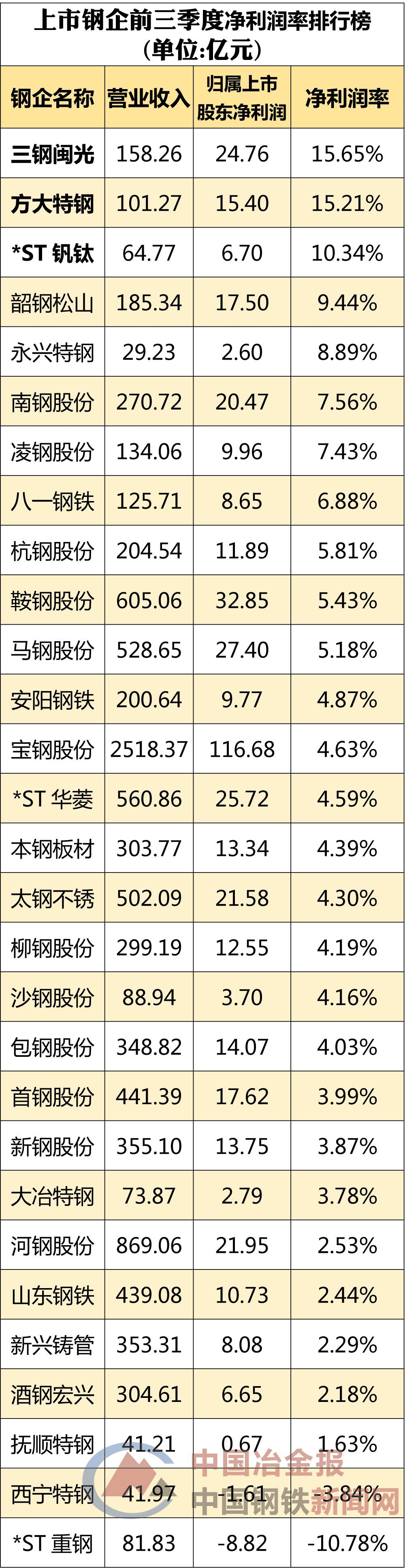 三钢闽光、方大特钢、*ST钒钛三家钢企的净利润率均超过10%。展望四季度,三钢闽光表示,在开展大气污染治理的专项行动,以及在严格的环保督查等政策措施的大力推进下,预计福建钢材市场库存仍将处于较低水平,钢材价格仍将处于较高水平,四季度公司的经营环境仍将较为有利。预计 2017 年 全年归属于上市公司股东的净利润比上年同期上升236%-286%,金额为 31.18 亿元至 35.83 亿元之间。